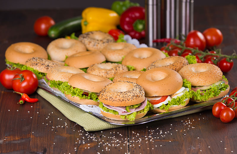 Bagel belegt mit:Bulette mit Apfel-Zwiebel-Chutney ∙ Hähnchenbrust mit Erdbeer-Ingwer-Chutney ∙ Räucherlachs mit Dill-Senf-Sauce und Gurke ∙ Serrano-Schinken mit Mango-Chutney ∙hausgemachter Schafskäsecreme mit Tomate, Gurke und Paprika